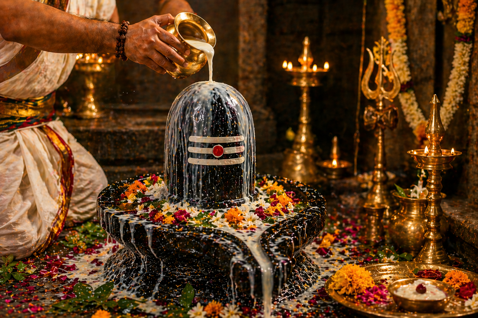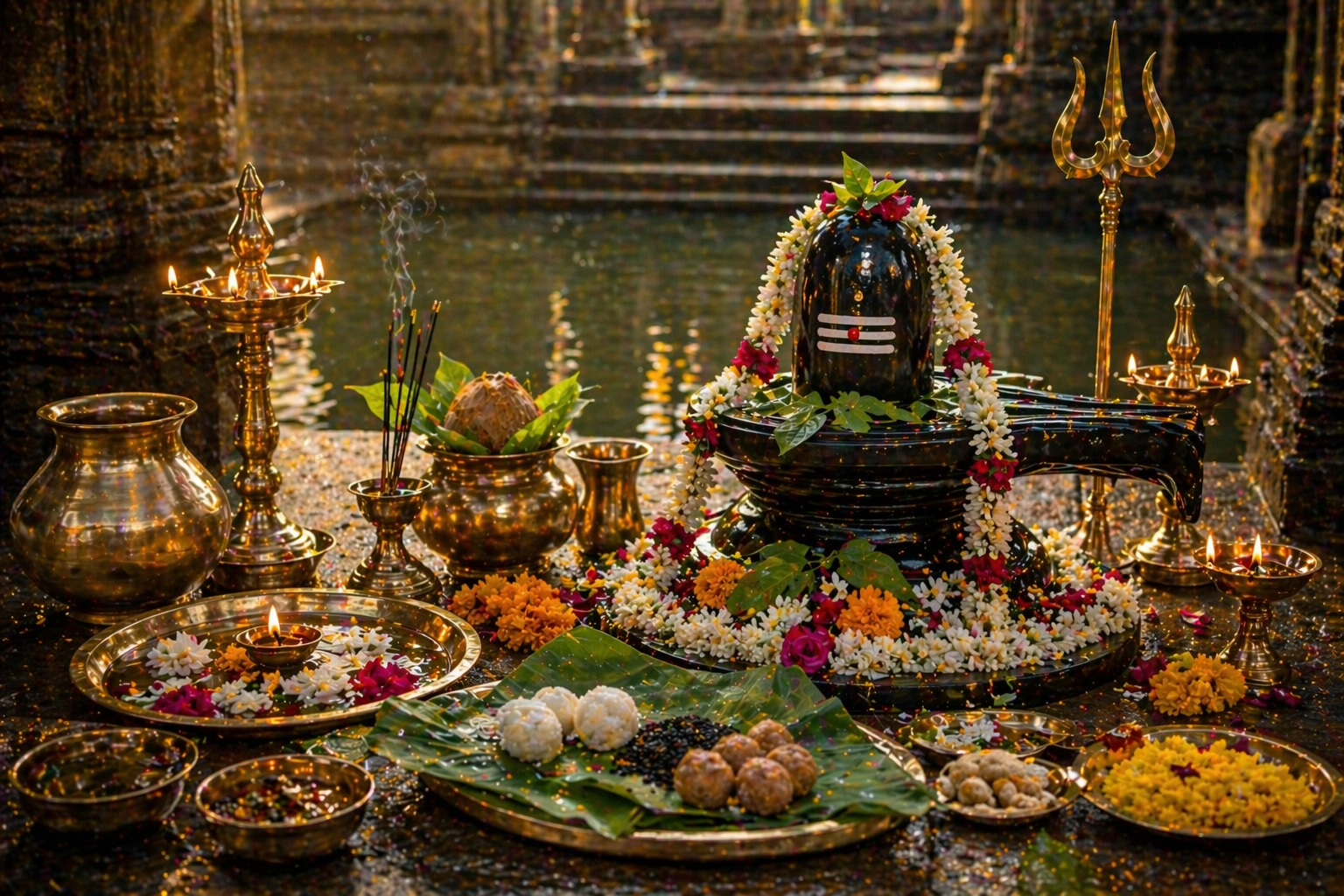 Traditional rituals at the Trimbakeshwar Jyotirlinga including Kalsarp Puja, Narayan Nagbali Puja, Pitra Shanti Puja, Mahamrityunjay Jaap Anushthan, and Rudra Abhishek for spiritual balance and dosh nivaran.
